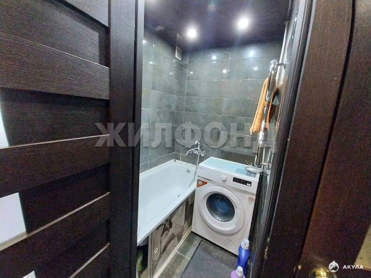 Потолок -натяжные потолки со встроенными светильниками, пол - качественный ламинат, в санузле новый кафель.