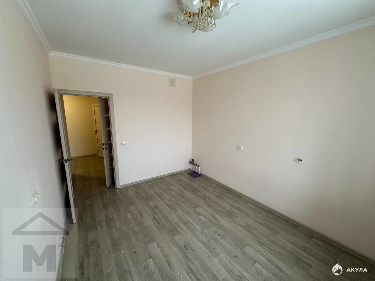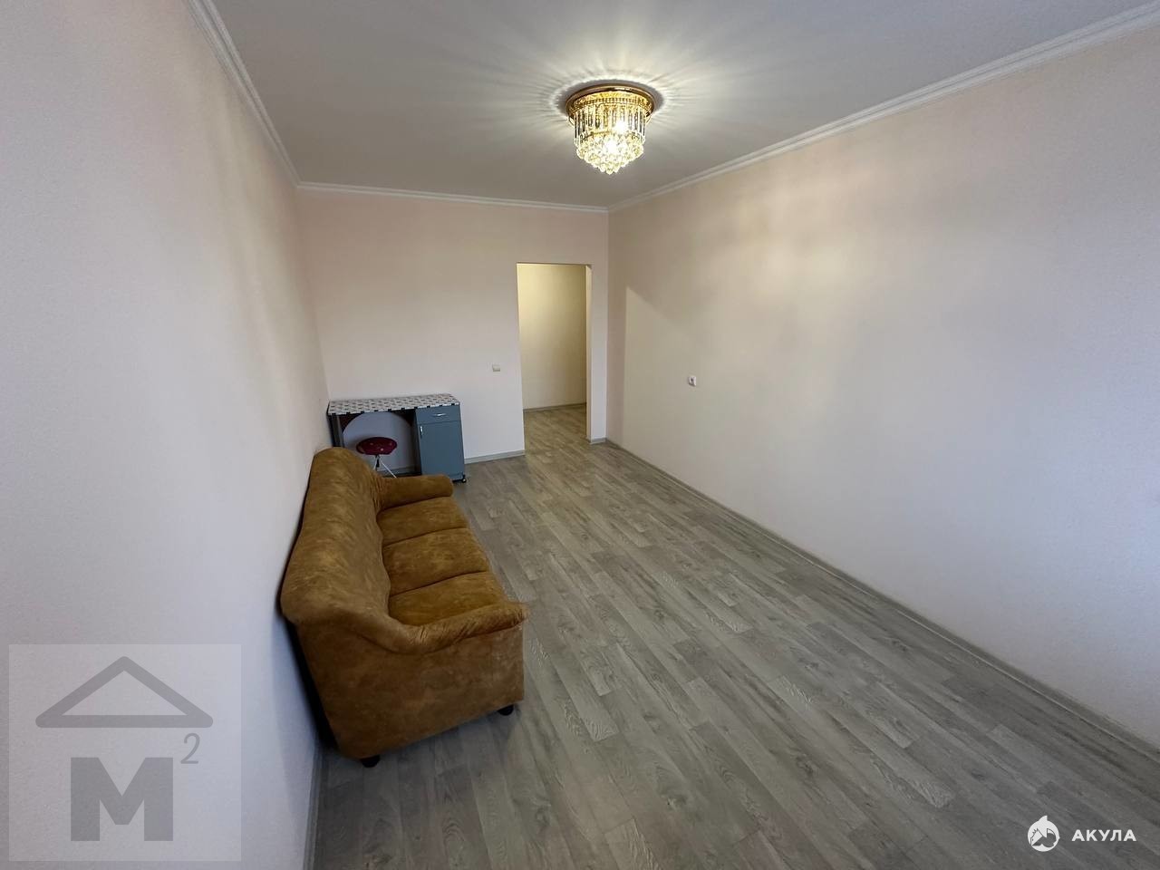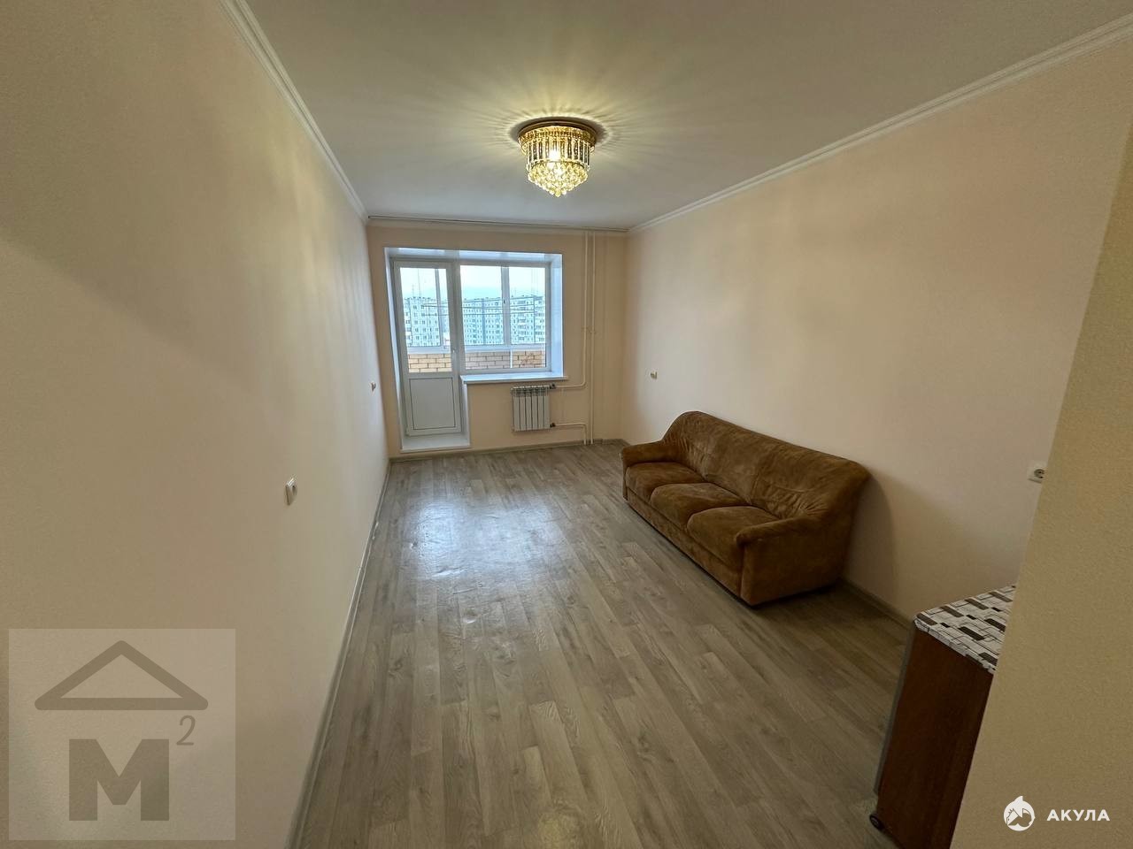 Квартира полностью готова к проживанию — выполнен свежий качественный ремонт в спокойных светлых тонах: ламинат на полу, натяжные потолки с красивой хрустальной люстрой, стены в бежевых оттенках создают атмосферу тепла и уюта. Просторная комната совмещает зону отдыха с удобным диваном и место для работы/хранения. Есть остаток мебели (диван, шкафы).