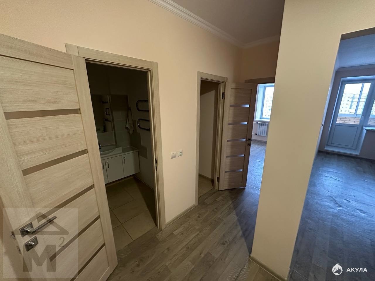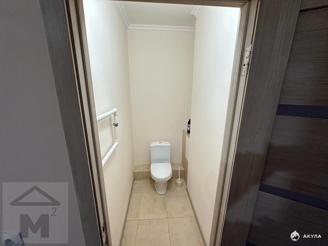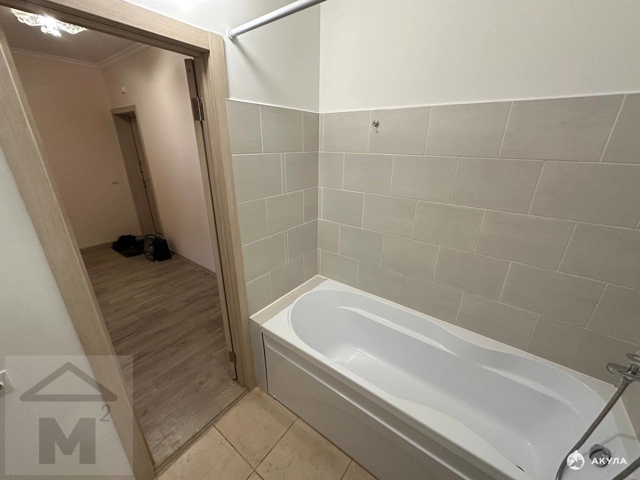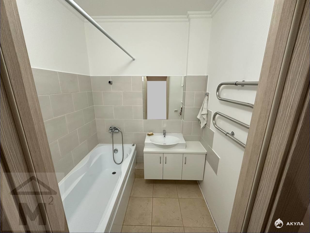 Современная ванная комната с ванной, раковиной и отдельный санузел — всё в новой плитке, с полотенцесушителем. Кухня функциональная, с возможностью установки всей необходимой техники.