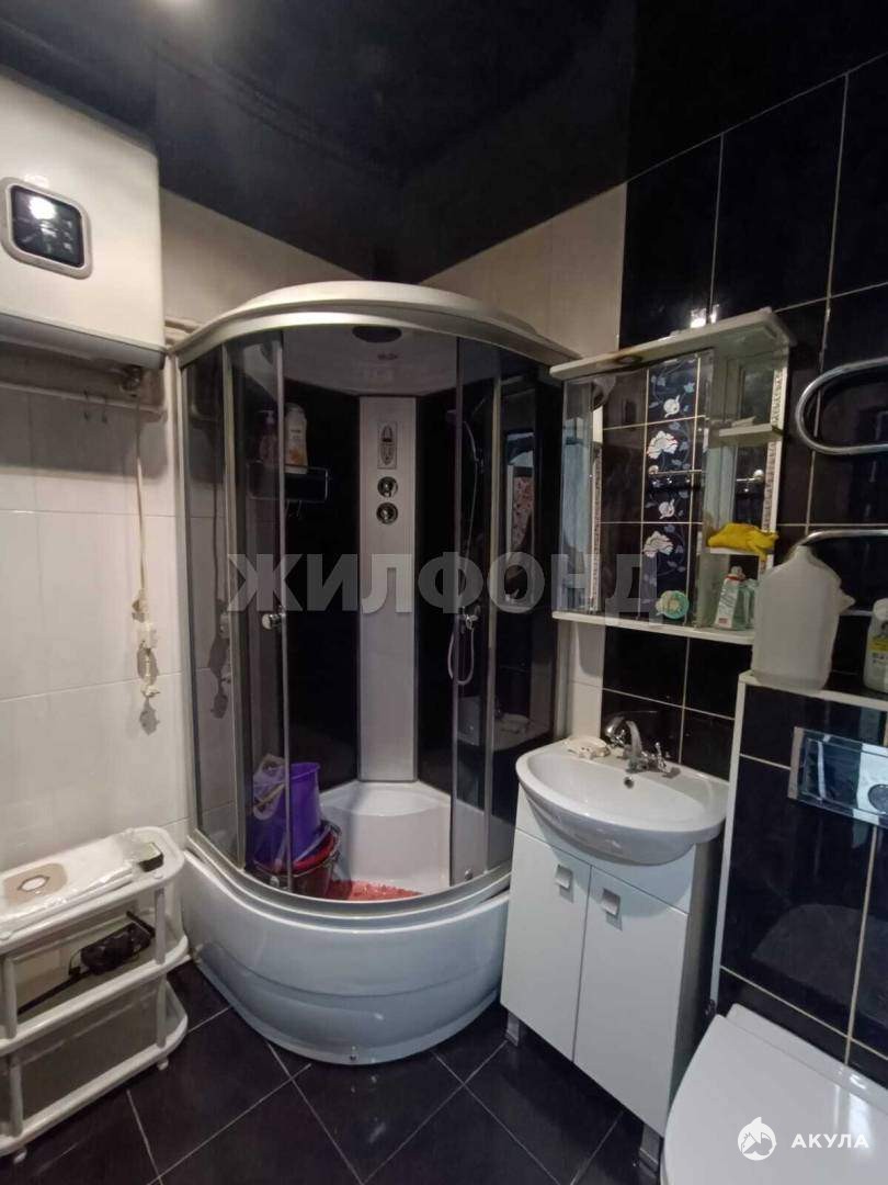 В совмещенной ванной комнате на полу керамогранит, душевая кабина и водонагреватель.