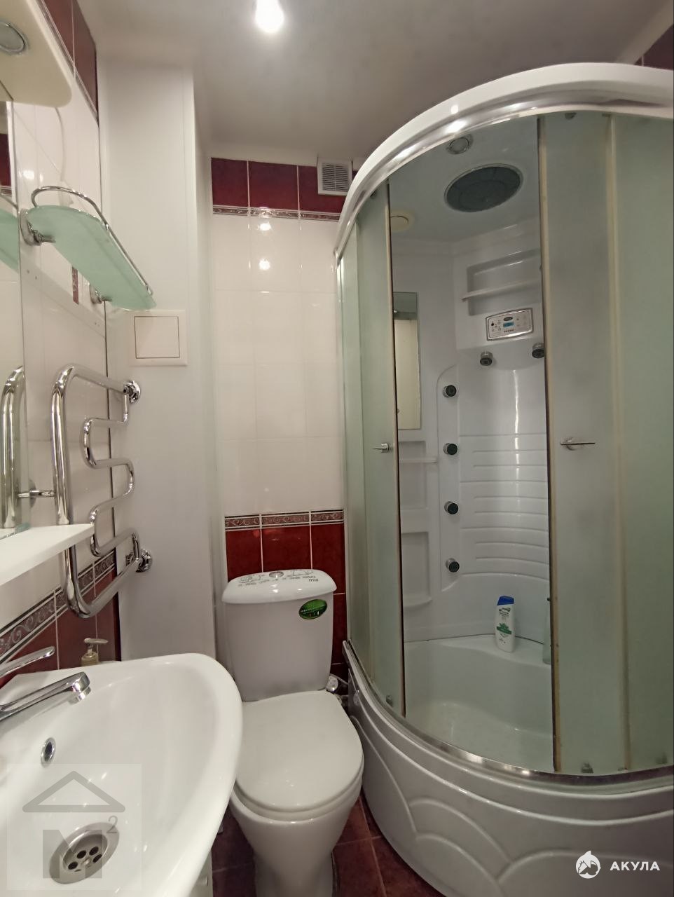 Совмещенный санузел отделан кафелем и оборудован душевой кабиной, что экономит пространство и облегчает уход.