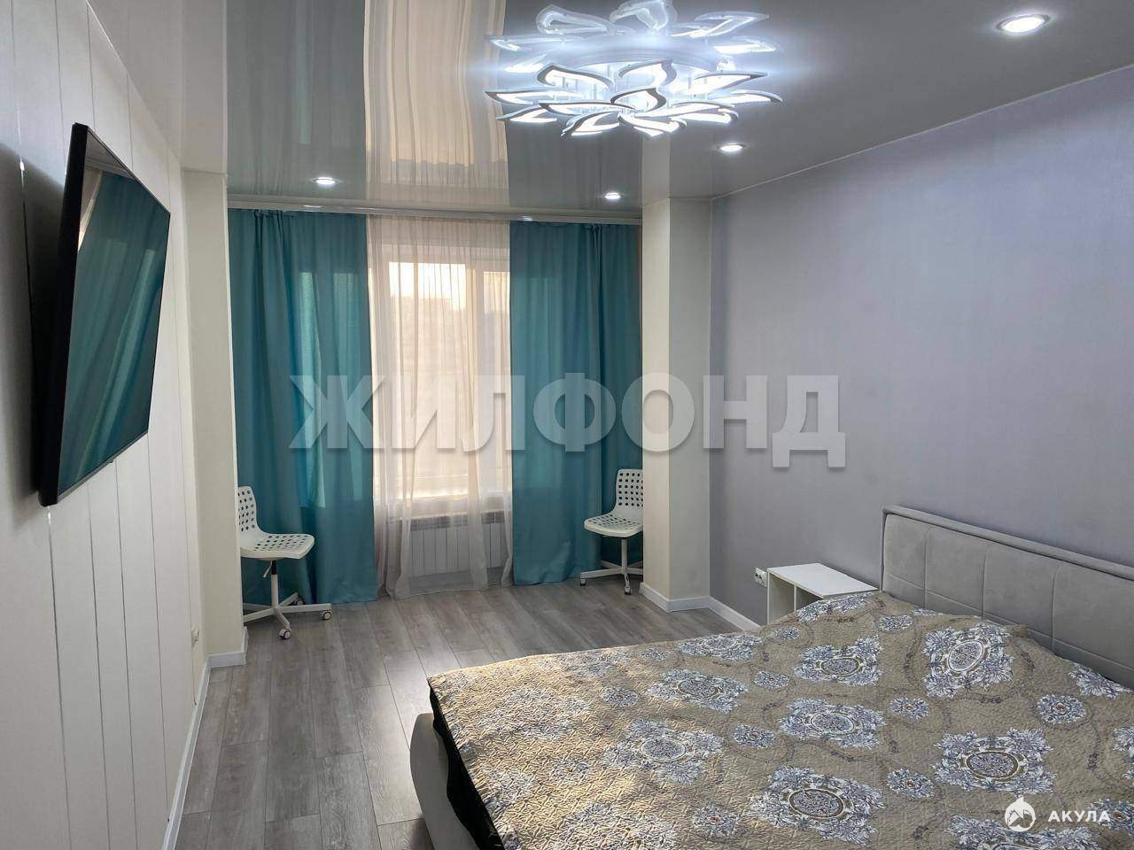 На стенах флизелиновые обои, на полу ламинат, потолок натяжной с различными типами светильников (сенсорные выключатели люстры с управлением через wi-fi) .