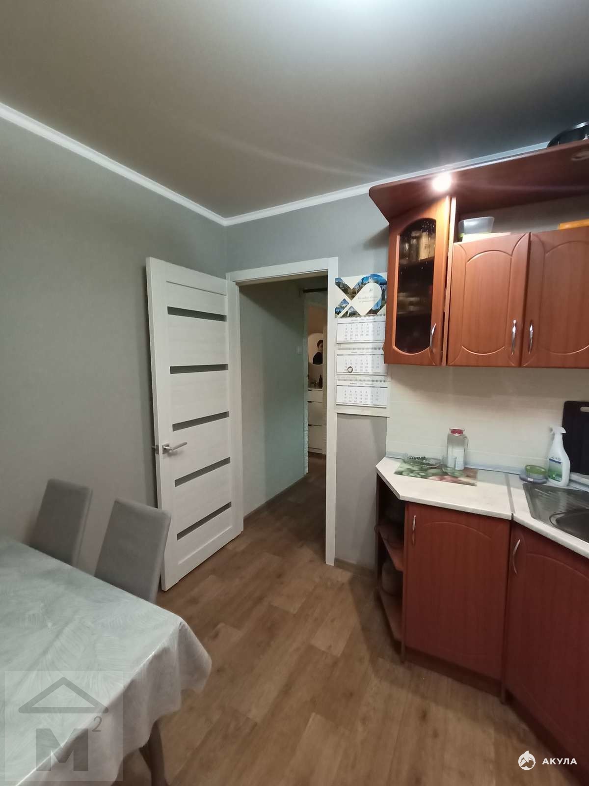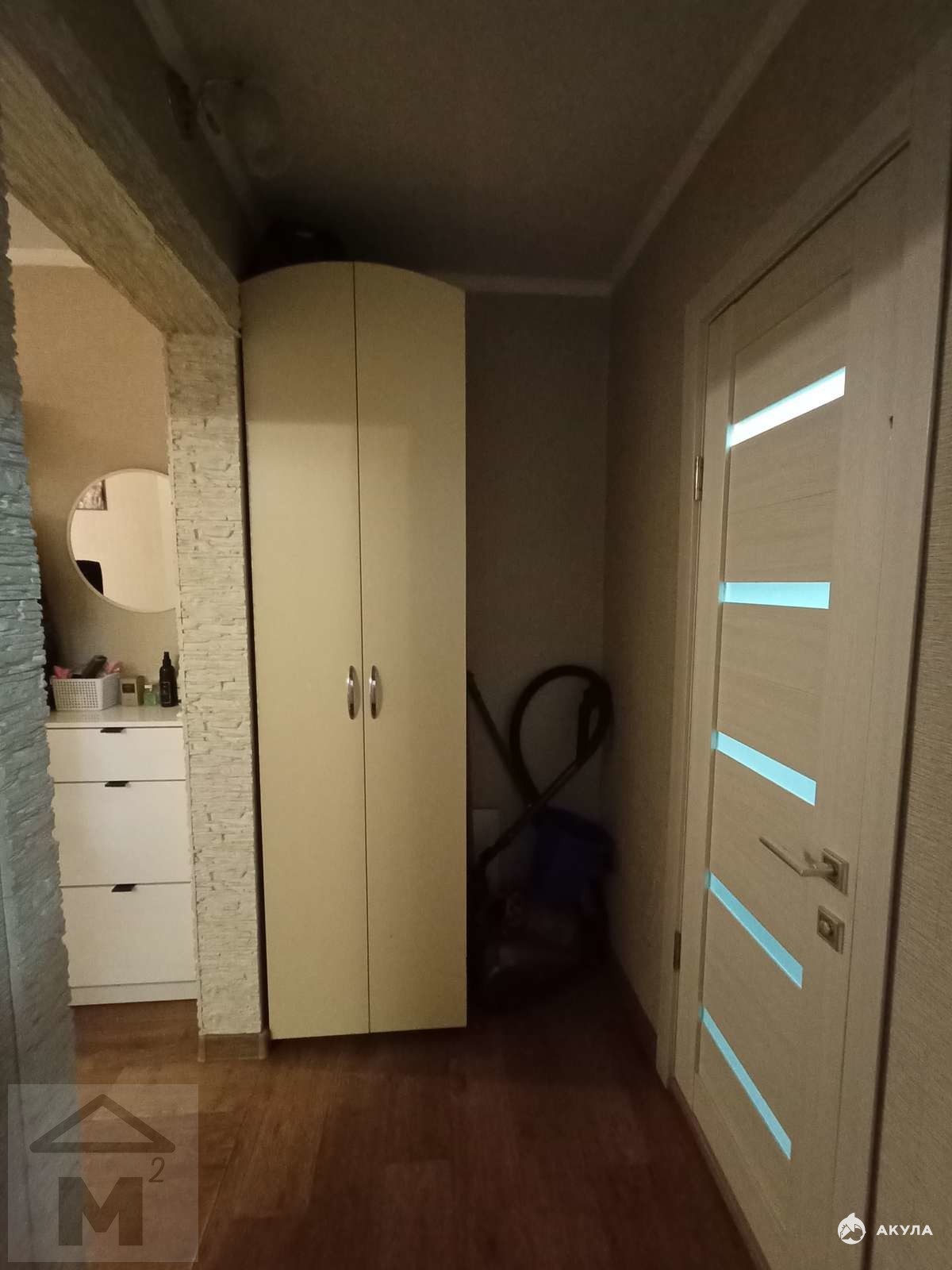 В квартире останется большой угловой кухонный гарнитур и шкаф для хранения в ванной комнате. В прихожей есть небольшая ниша, куда можно установить встроенный шкаф-купе.