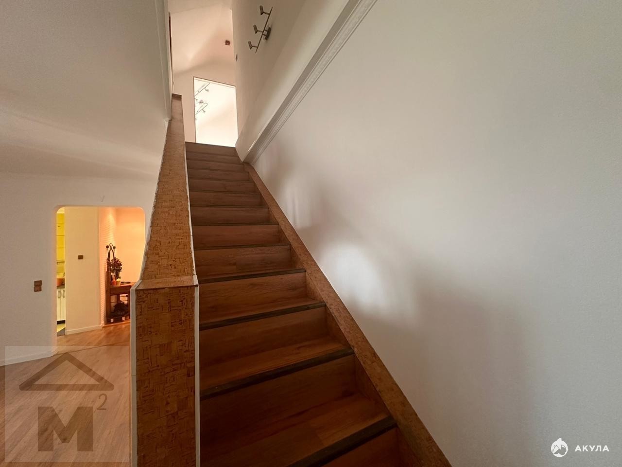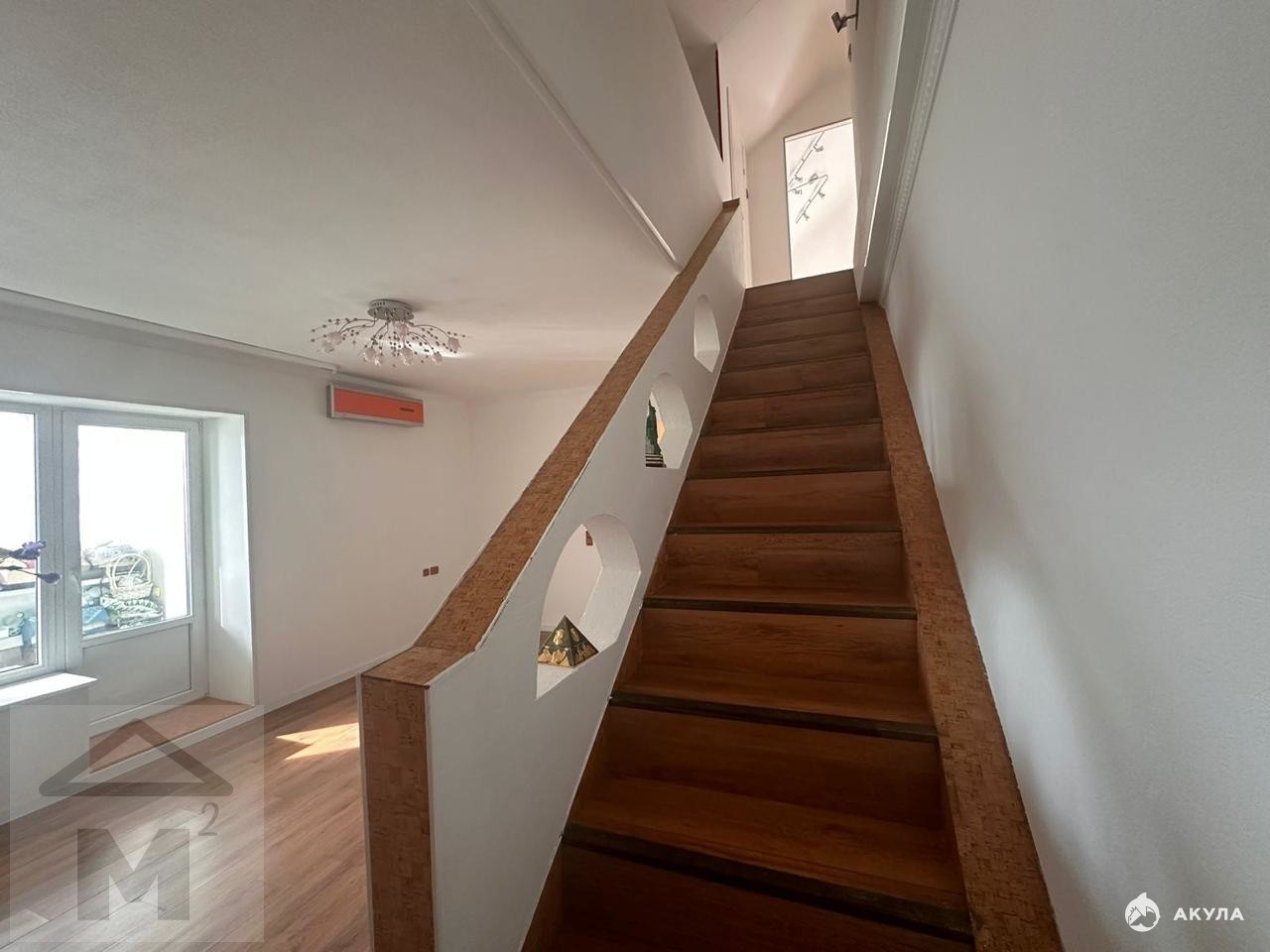 Первый уровень: кухня, гостиная с выходом на лестницу, две изолированные спальни, просторный санузел, лоджия.